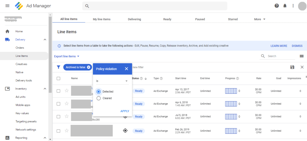 - Apply filters such as Policy Violations to see which creatives have been flagged for violating Google’s policies.