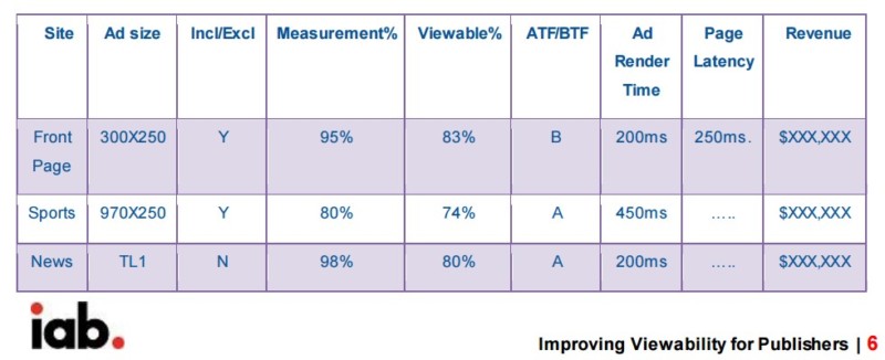 Optimizing for viewability will need engaging content, along with paying attention to site design, ad layout, latency, and ad ops. Take an inventory of your impressions and map out impressions you want to optimize for/offer up as highly viewable. IAB Viewability Primer has a sample template: