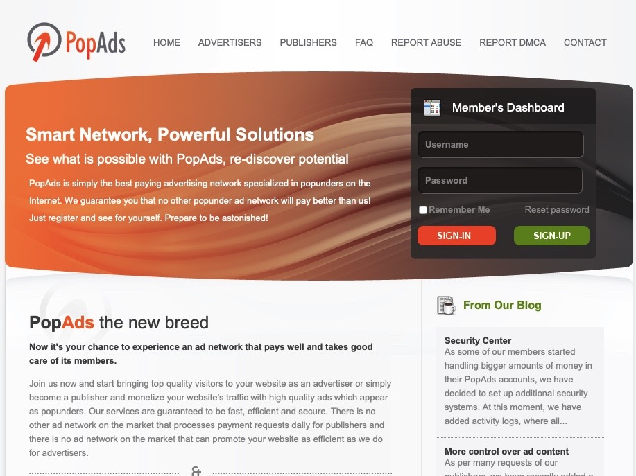 PopAds is an advertising network specialized in pop-unders. It’s a good solution to put pop ads on multiple sites.