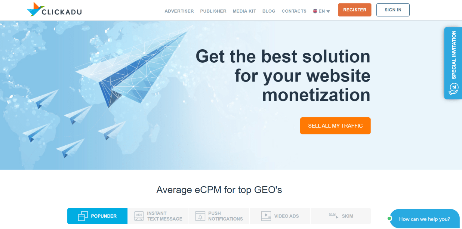 Publishers can serve ads in over 240 countries with Clickadu, which also promises high eCPMs and 100% fill rates. Publishers also have the option of going for either self-serve or managed services and are provided with detailed statistics of their websites.
