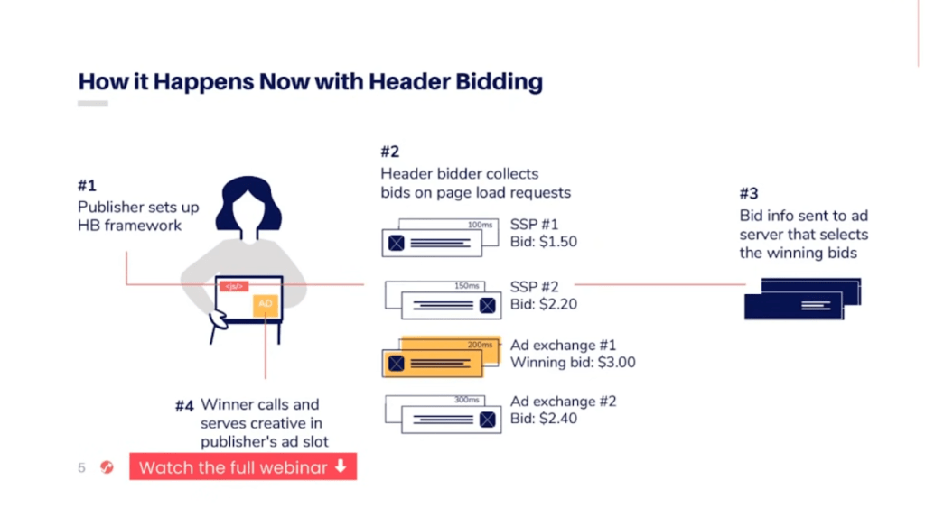 - Header Bidding: It is a technique where publishers simultaneously offer their ad inventory to various demand partners. The SSP collects all the bids from the advertisers and lends the ad space to the winning bid. Header bidding goes by many names, such as holistic yield management, pre-bidding, or advance bidding.
