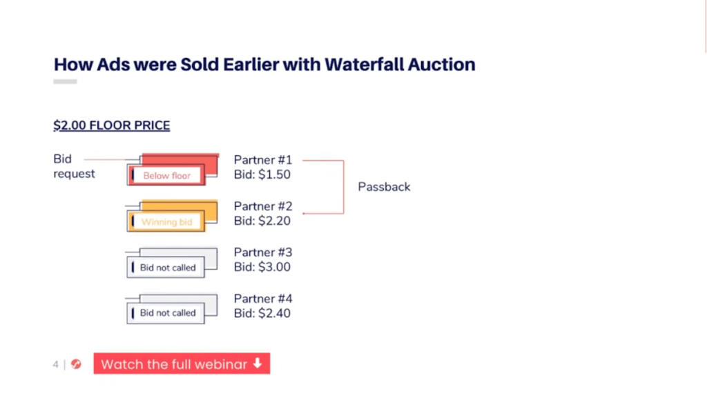 - Waterfall Auction: Also called waterfall tags or daisy-chaining, publishers call upon ad networks one-by-one in descending order of their average yield (ad networks with a history of placing higher will be given priority) to place their bids until all ad scape or impressions are sold.