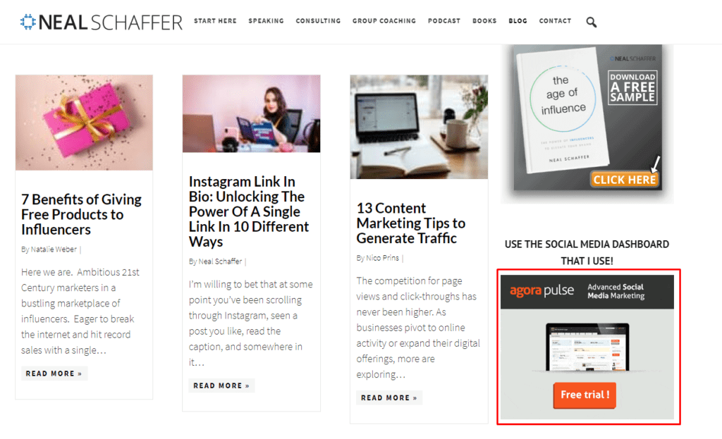 Let’s take a look at Neal Schaffer’s blog. As a business growth consultant who specializes in social media marketing. And he has collaborated with AgoraPulse, a social media tool, to get the best CTR and hence revenue.